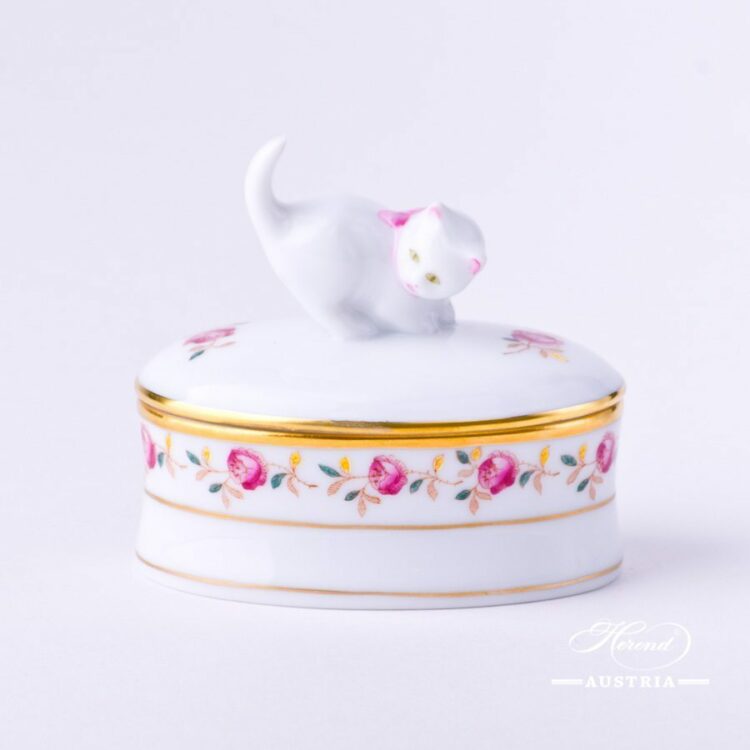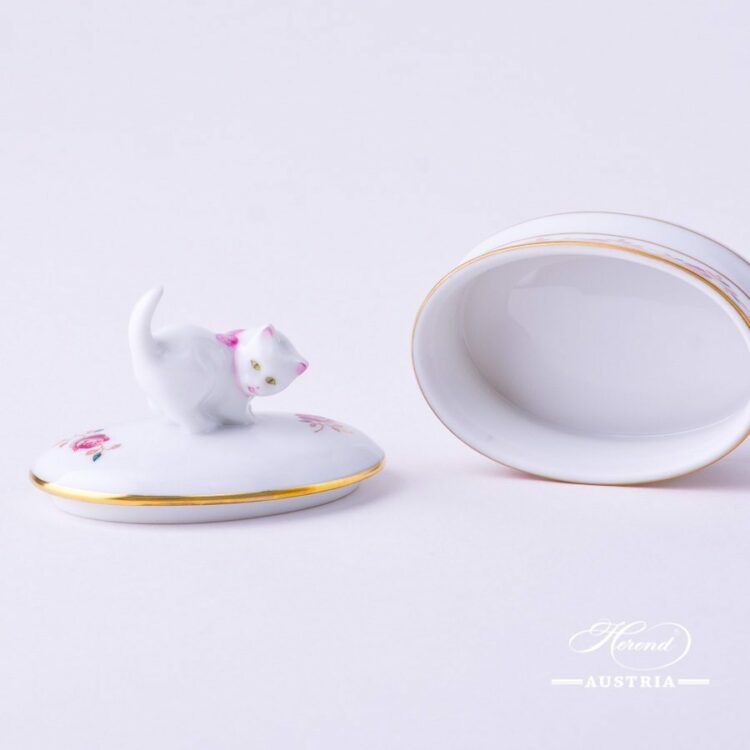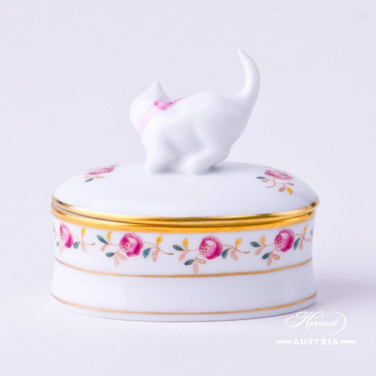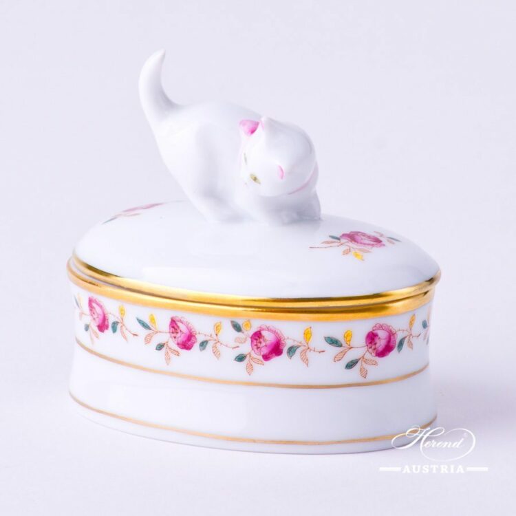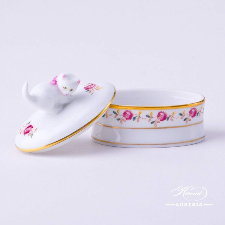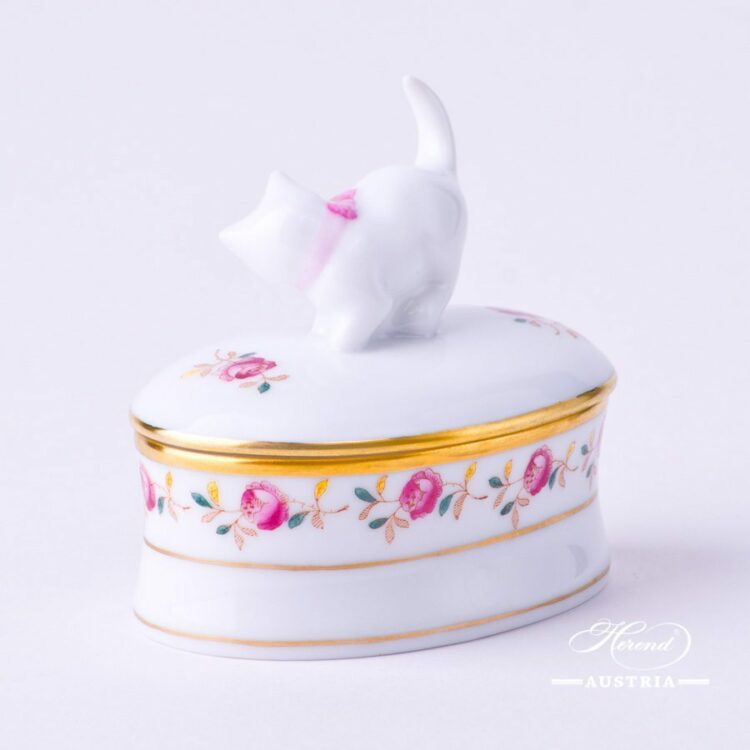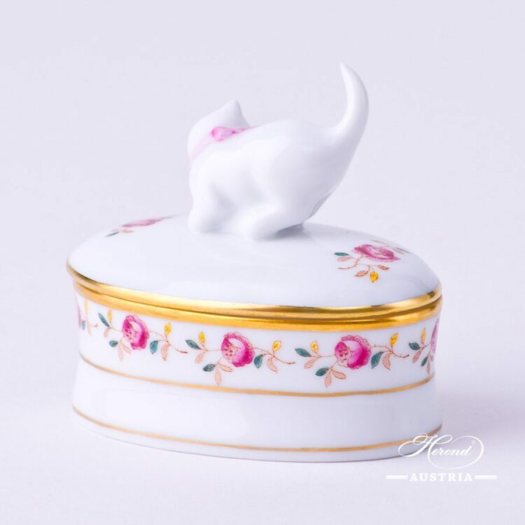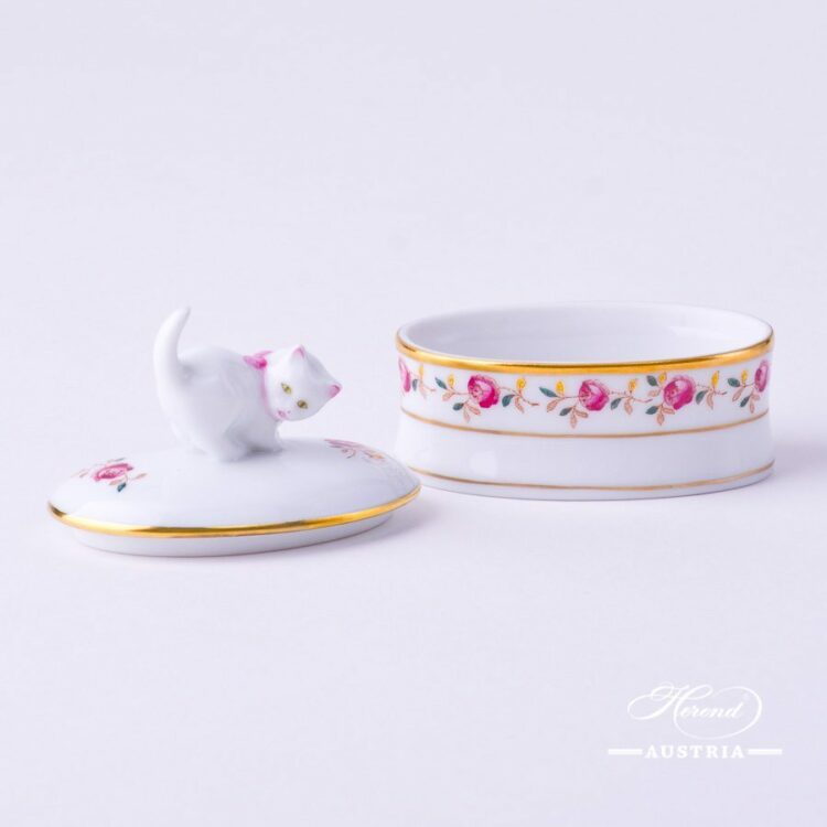 Oval shaped Bonbonniere / Candy Jar w. Cat Knob – Herend Rose Garland RGS pattern.