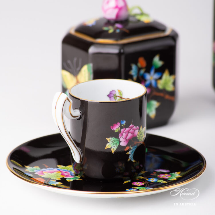 Herend fine china Coffee / Espresso Set for Two Persons – Herend, Queen Victoria on Black Background – VE-FN pattern.