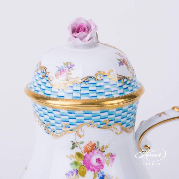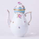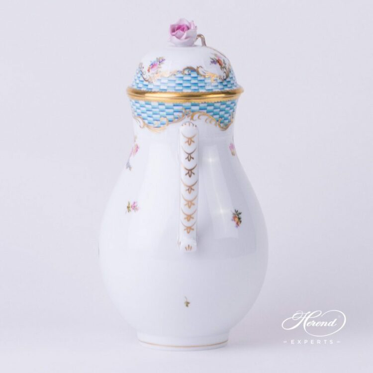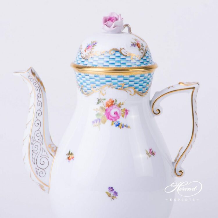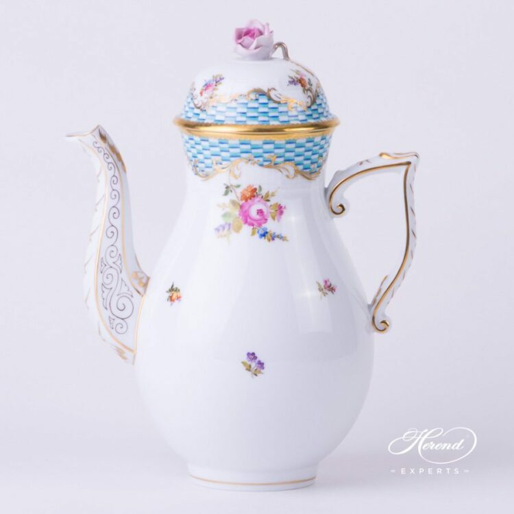 Herend porcelain Coffee Pot with Rose Knob – Herend Flowers with Blue Scales decor.