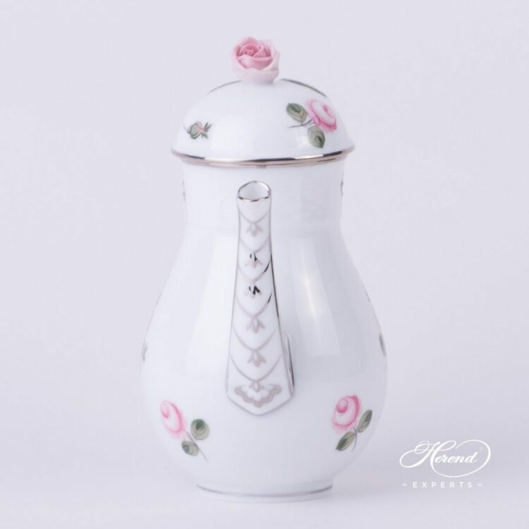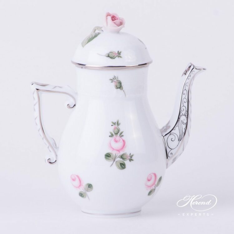 Herend porcelain Coffee Pot with Rose Knob – Herend Vienna Rose Platinum pattern.