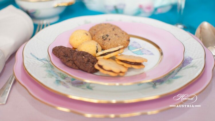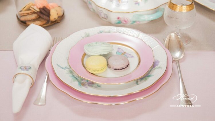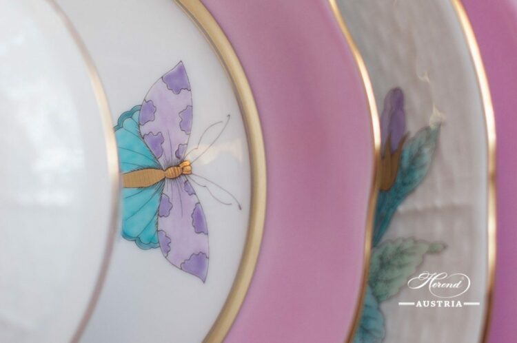 Dessert Plate, medium – Herend, Silk Ribbon Pink Edge w. Butterfly – E-520 pattern.