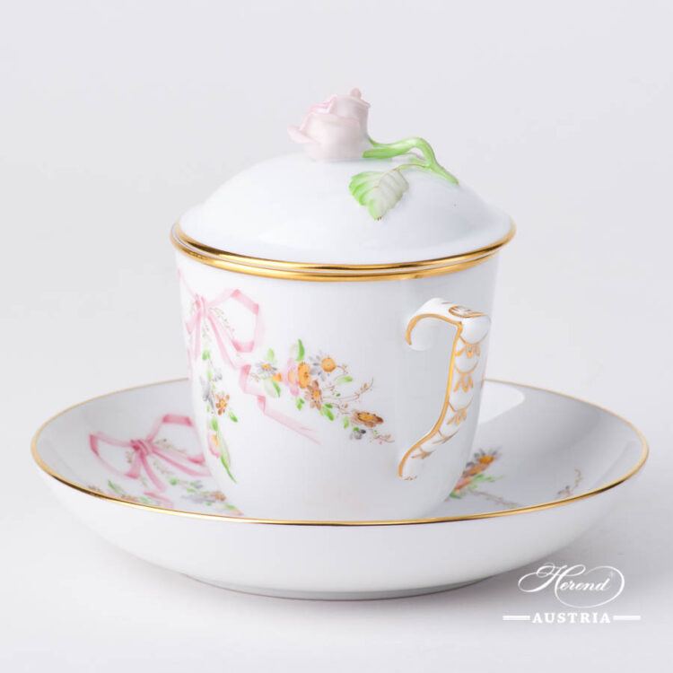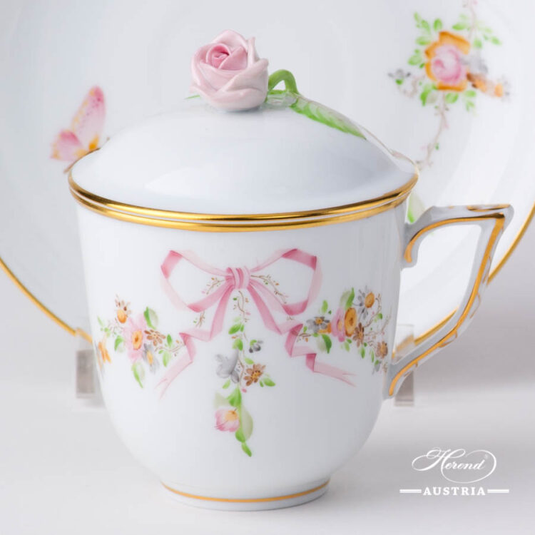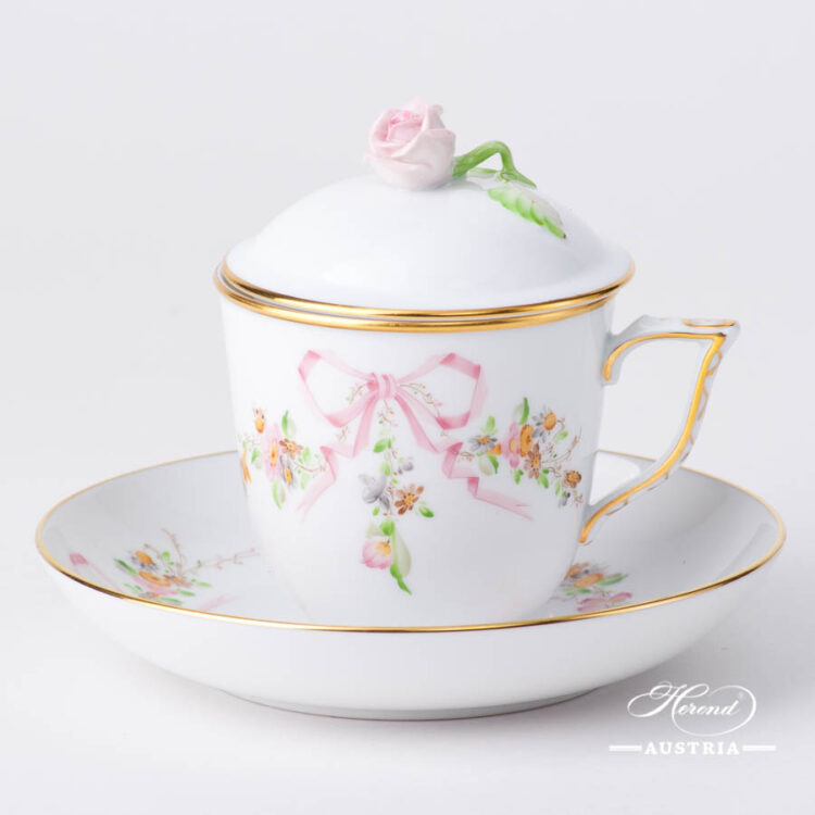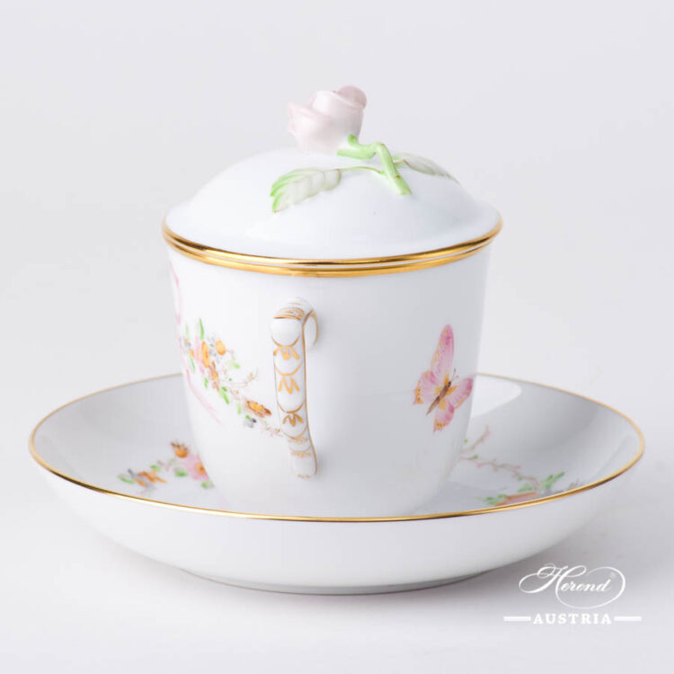 Herend Tea / Coffee Cup w. Saucer and Lid fine china painted with Eden Pink – EDENP design.