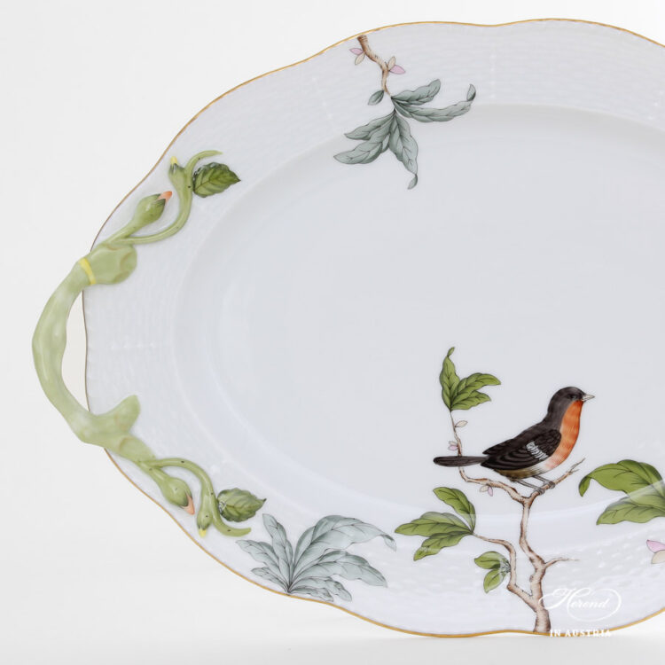 The large Herend tray is manufactured with Branch handles and painted with the FORET design. The Foret design is a variation of the Rothschild Birds design.