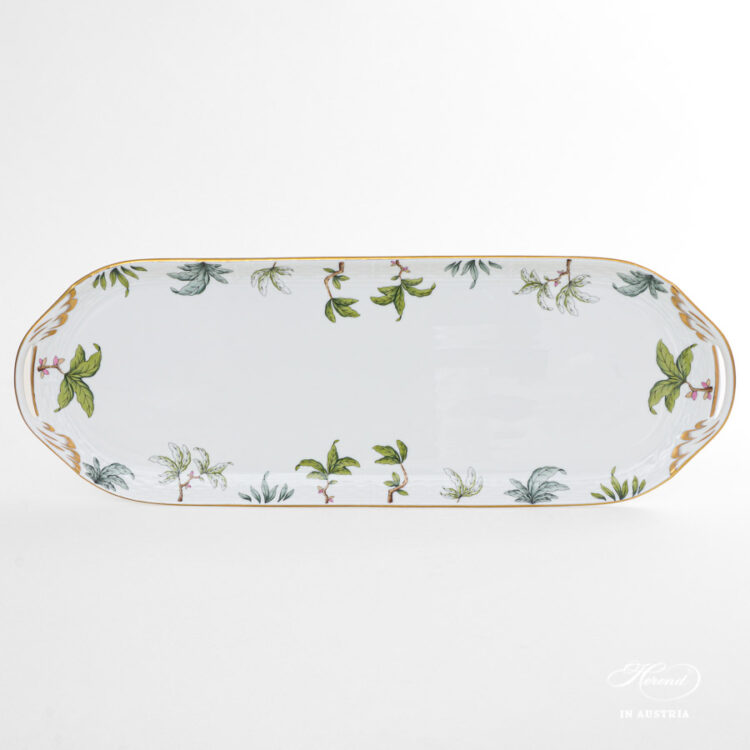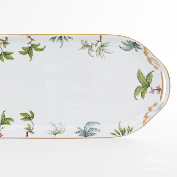 The Sandwich Dish is hand-painted with the floral elements of the FORET Herend design. The FORET design builds on the traditional elements of the Rothschild Bird design.