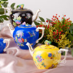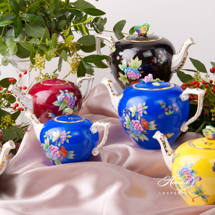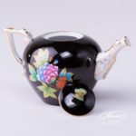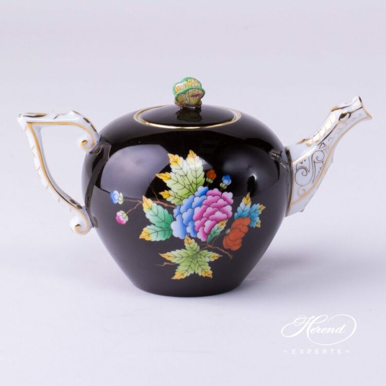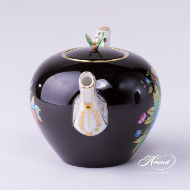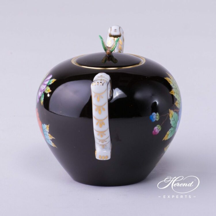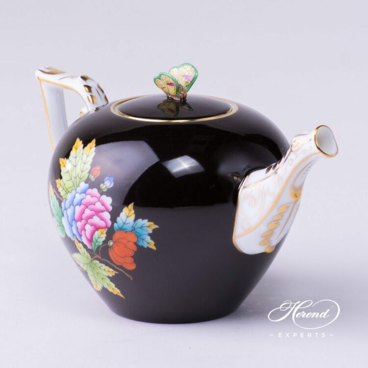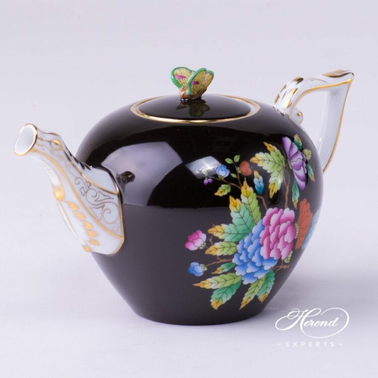 Herend porcelain Miniature Tea Pot w. Butterfly Knob – Herend Queen Victoria on Black Background design.