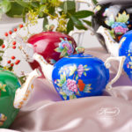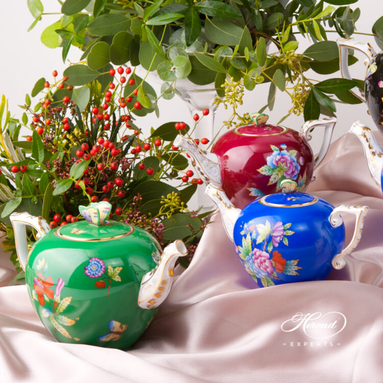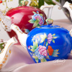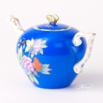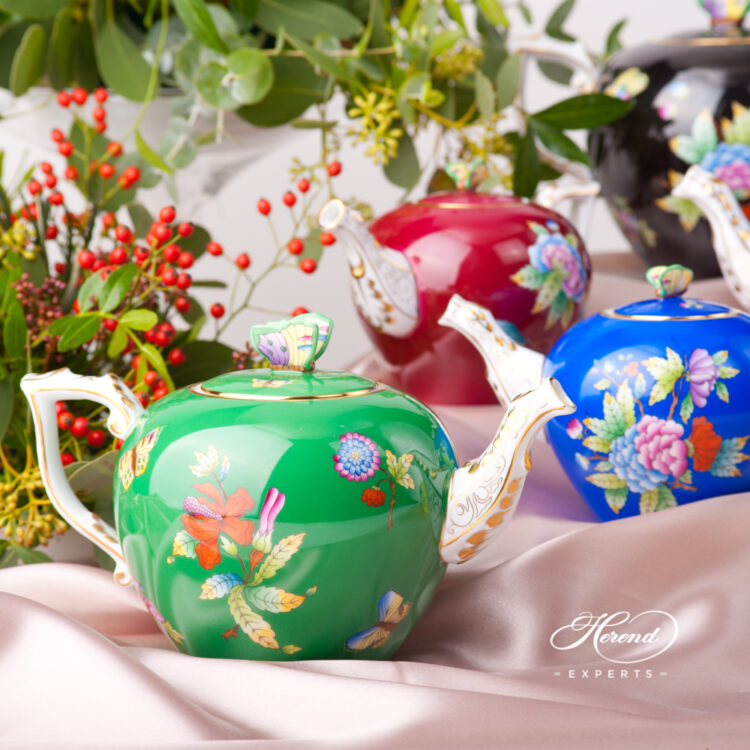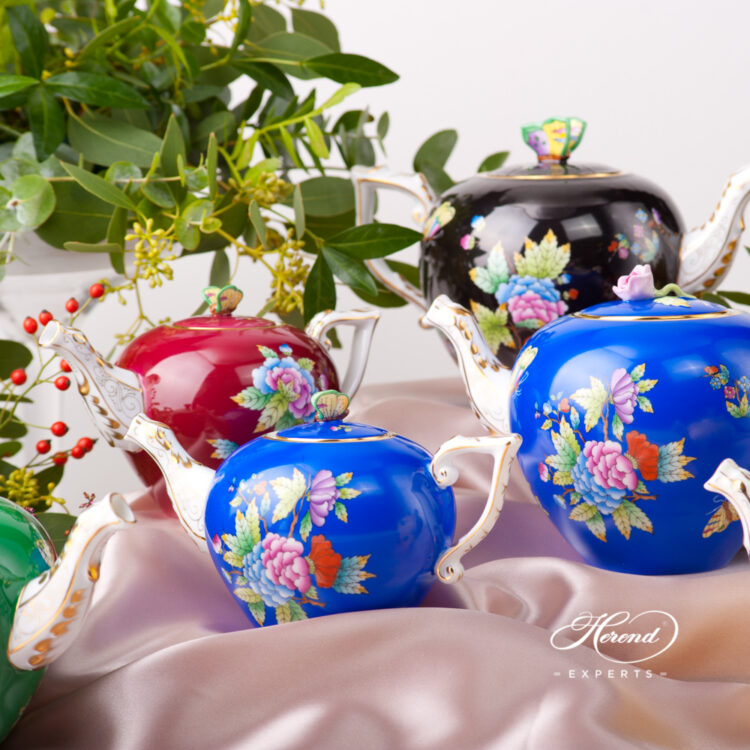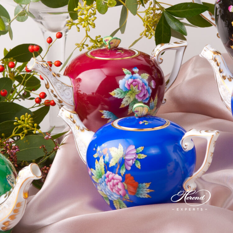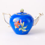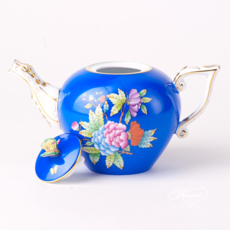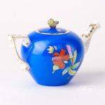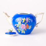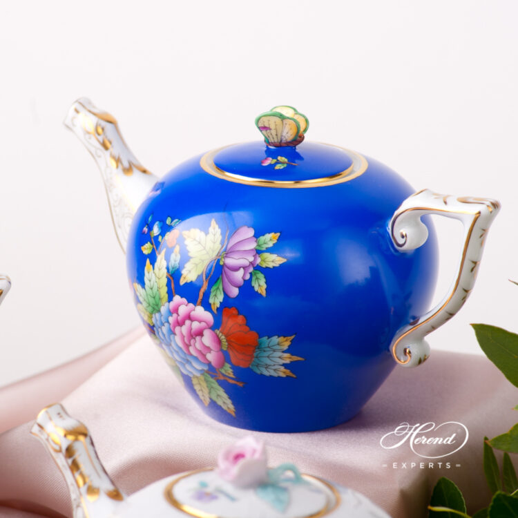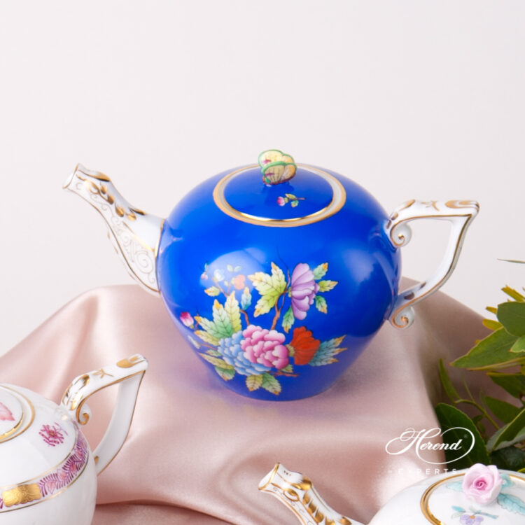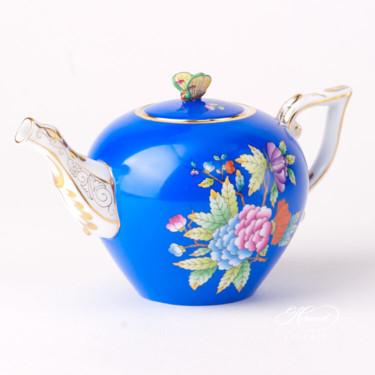 Herend porcelain Miniature Tea Pot with Butterfly Knob – Herend Queen Victoria VBO design on Blue Background.