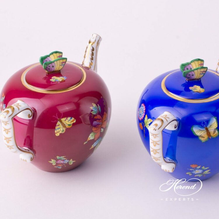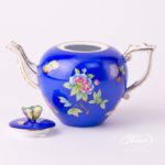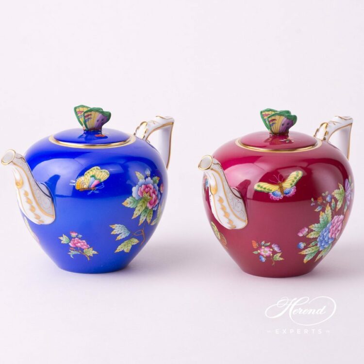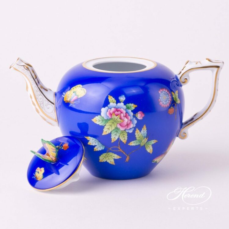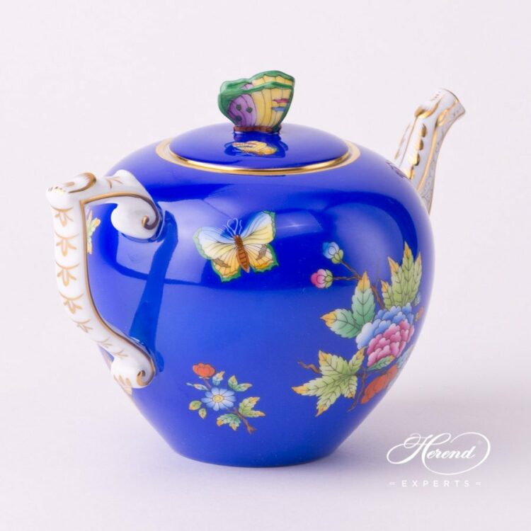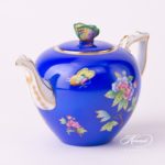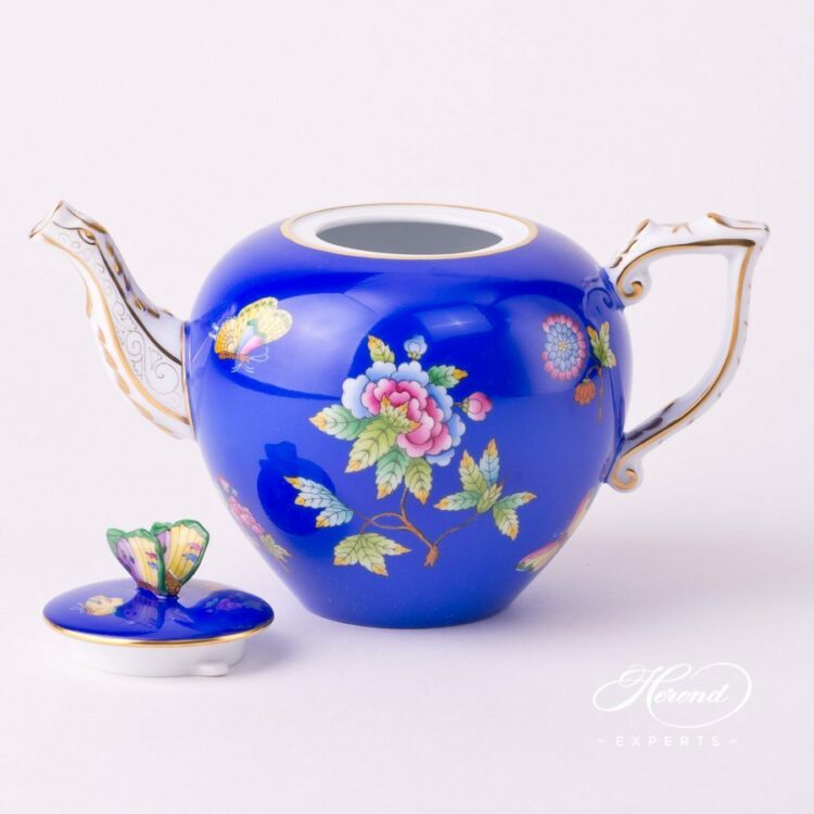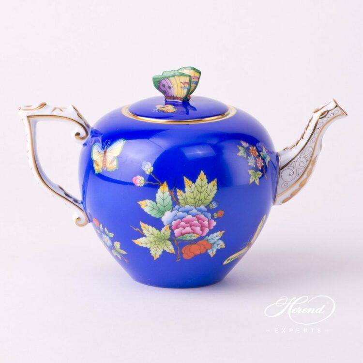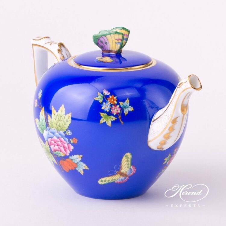 Herend porcelain Tea Pot with Butterfly Knob – Herend Queen Victoria VBO design on Blue Background.