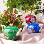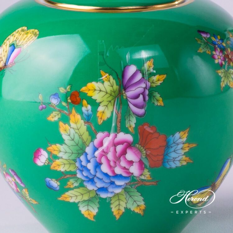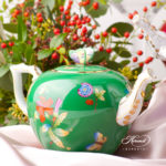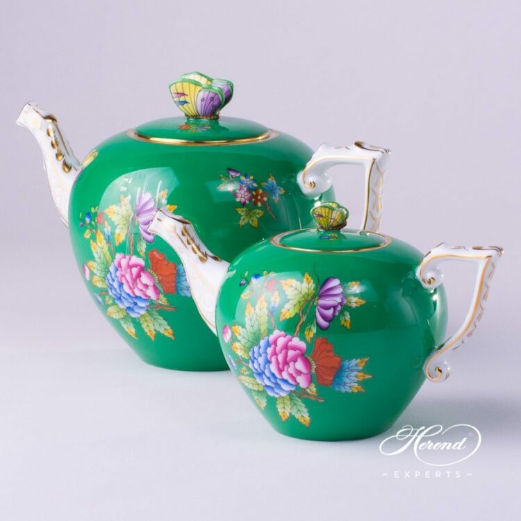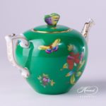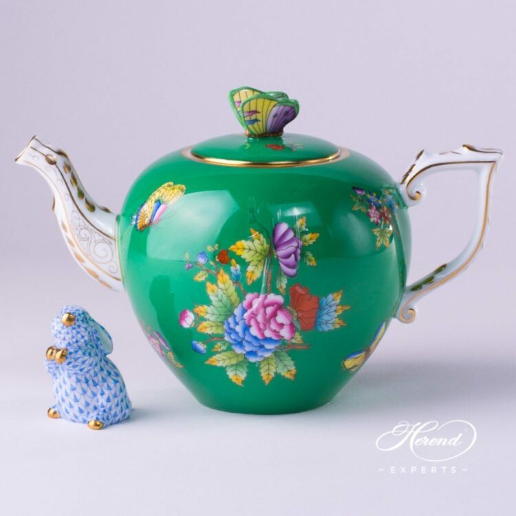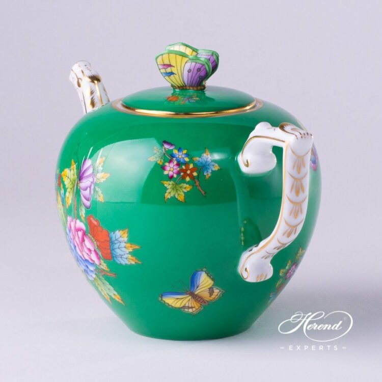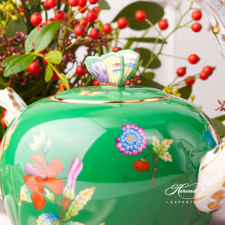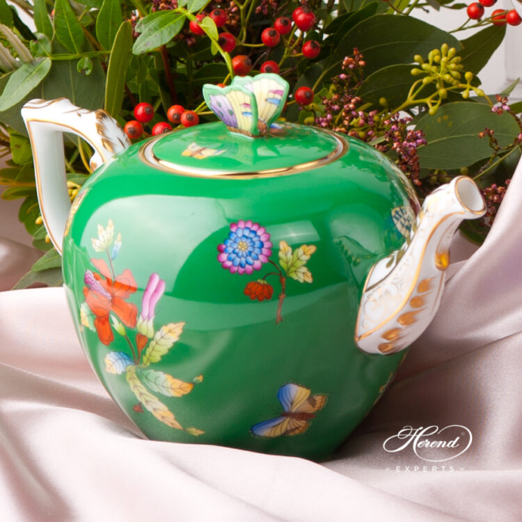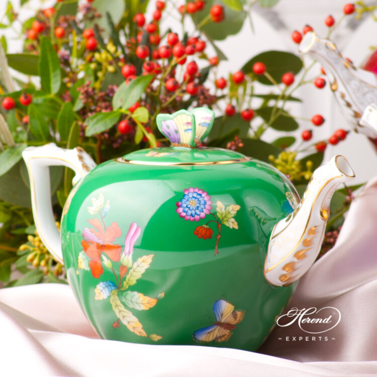 Herend porcelain Tea Pot with Butterfly Knob – Herend Queen Victoria VBO design on Green Background.