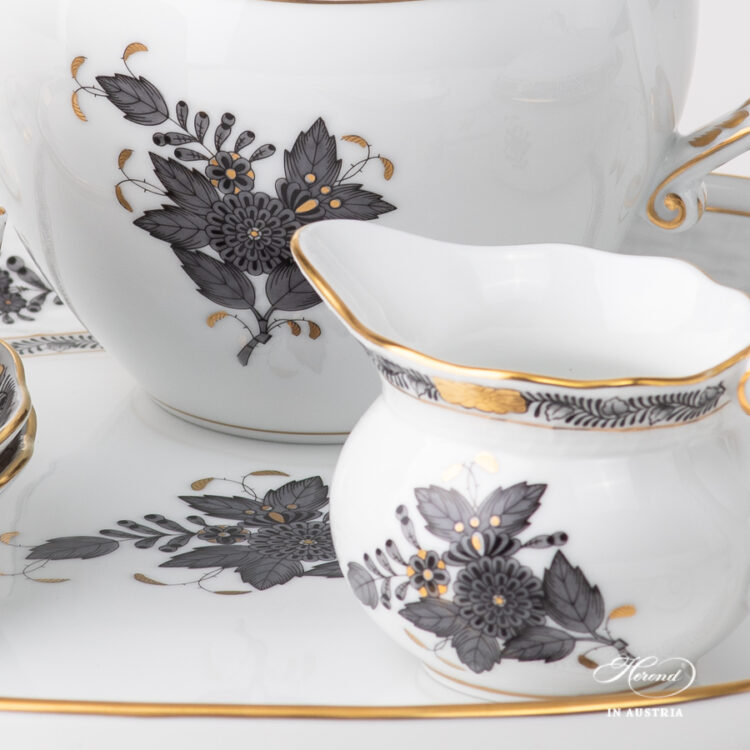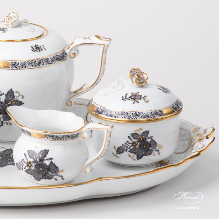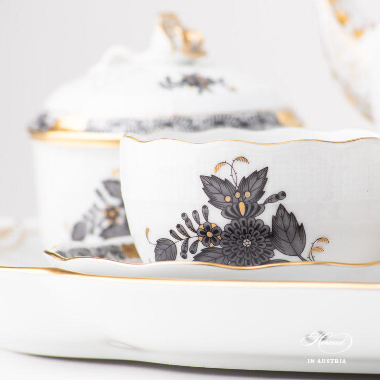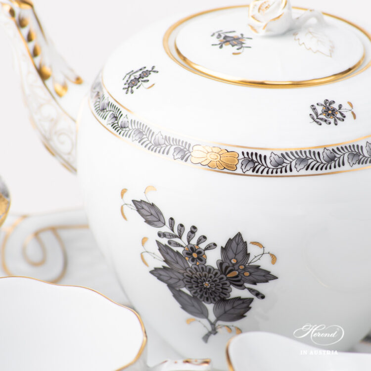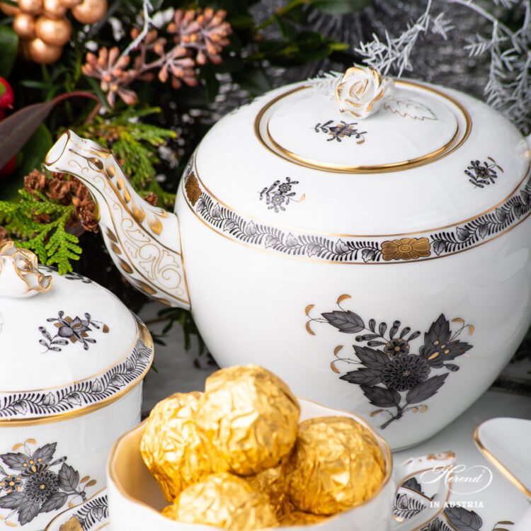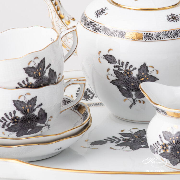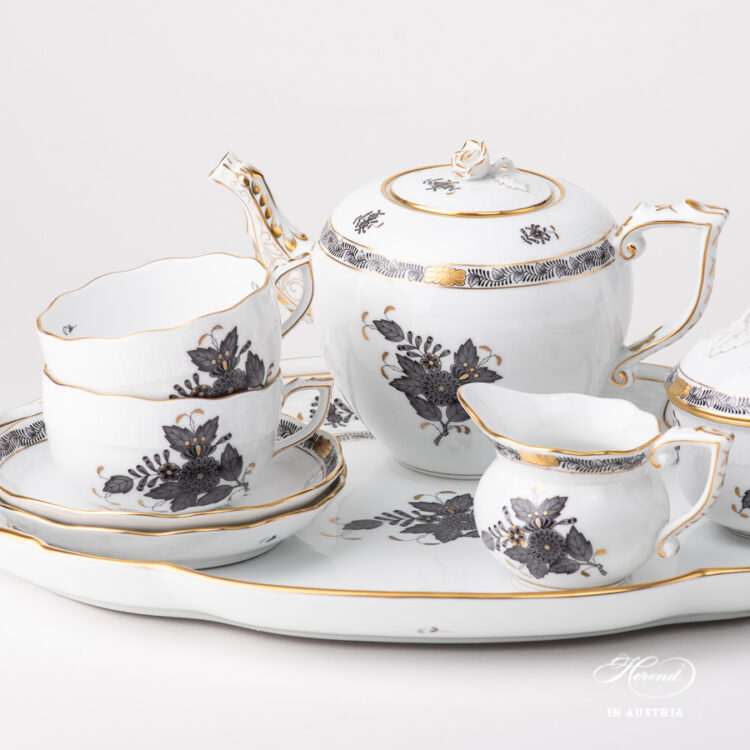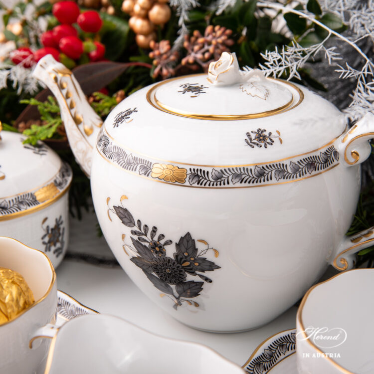 Herend fine china Tea Set for 2 People painted with the traditional Herend Chinese Bouquet – Apponyi Black – ANG pattern.