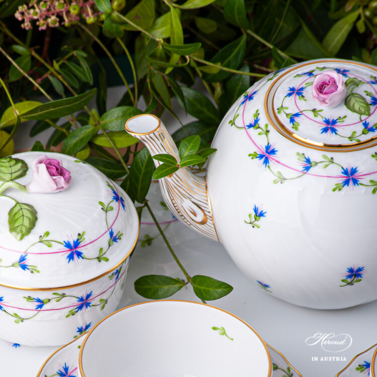 Herend porcelain Teapot with Pink Rose Knob painted with: Herend Cornflower Blue Garland decor.